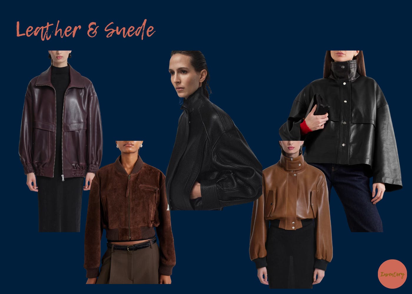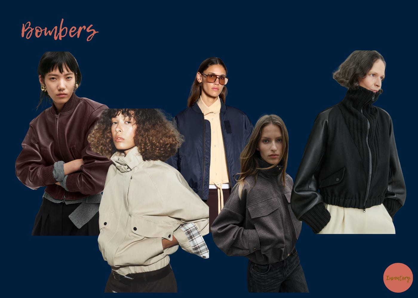 L-R: Leather Bomber Jacket, Oversized High-Collar Bomber Jacket, Bache Bomber Jacket, High Collar Bomber Jacket, Tarin Coat