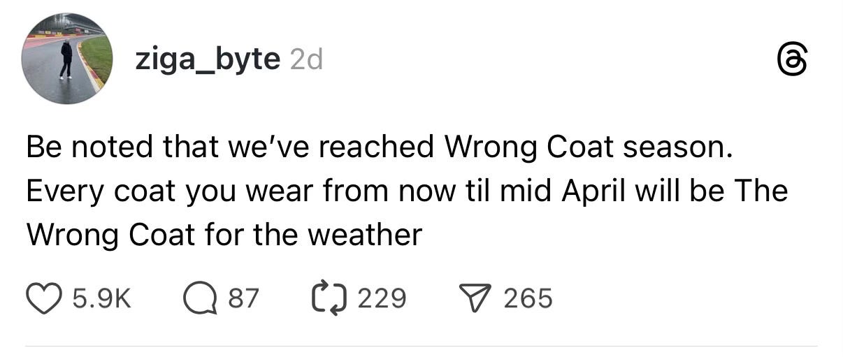 You can’t control the weather. But you can control your options. The goal isn’t to eliminate mistakes — that’s impossible. It’s to build a strong enough outerwear wardrobe that even your “wrong” coat still holds its own. Still makes sense with the rest of you.