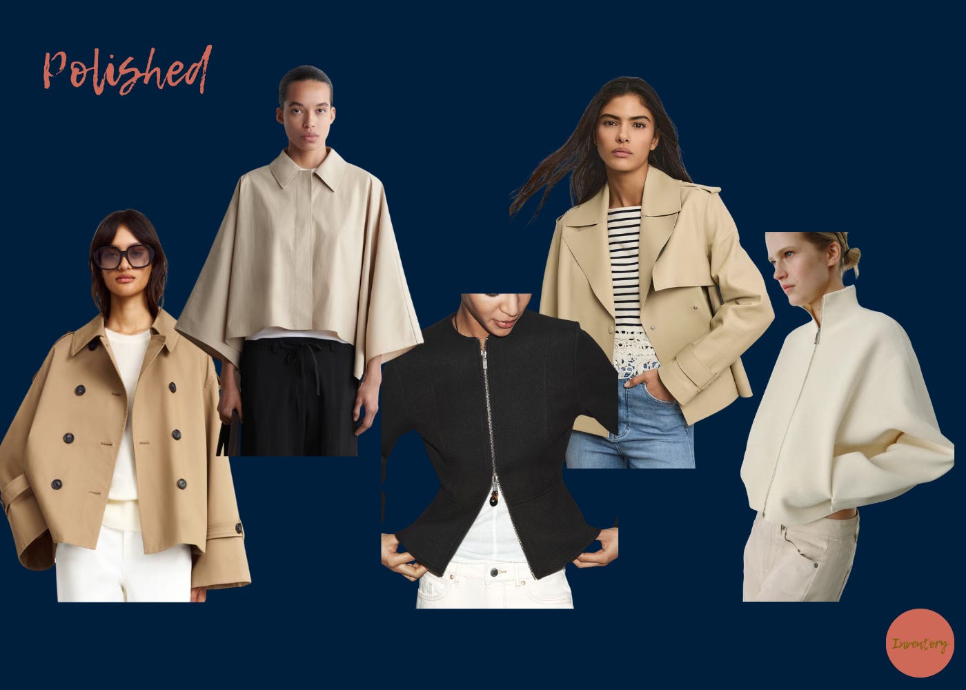 L-R: Alisandra Trench Jacket, Cropped Trench Coat Cape, Soft Peplum Jacket, Heathcliff Cropped Leather Trench Coat, Zipper Knit Cardigan